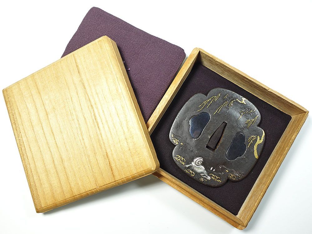 | メーカー | 肥後鐔 鉄地木瓜形枝垂柳伏馬図鐔 無銘 両櫃孔赤銅埋 金銀象嵌 肥後金工 桐箱入 肥後鐔 |